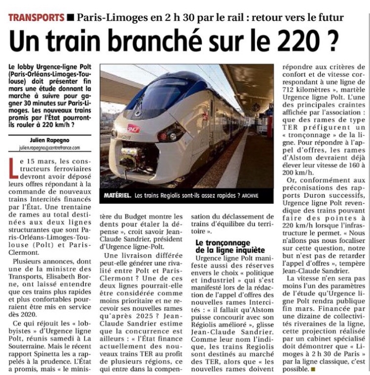 Dans la Montagne, du nouveau sur la modernisation du POLT mars 12, 2018 Paris-Limoges en 2h30 : les trains promis par l’État pourraient rouler à 220 km/heure ? 2018/03/11/paris-limoges-en-2h30-les-trains-promis-par-letat-pourront-ils-rouler-a-220-km-heure_12768702.html