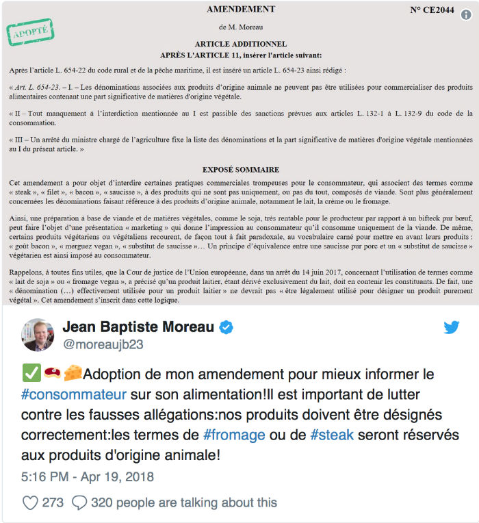Une autre section de l’amendement affirme que le fait de se servir des nutriments présents dans les produits végétariens pour faire croire aux consommateurs qu’ils mangent de la viande est aussi une fourberie.